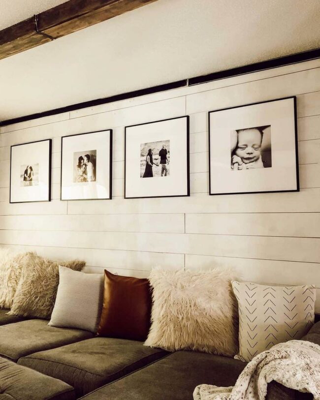 Elegant black and white photographs adorn a textured shiplap wall, creating a captivating focal point with crisp white mats and bold black frames.