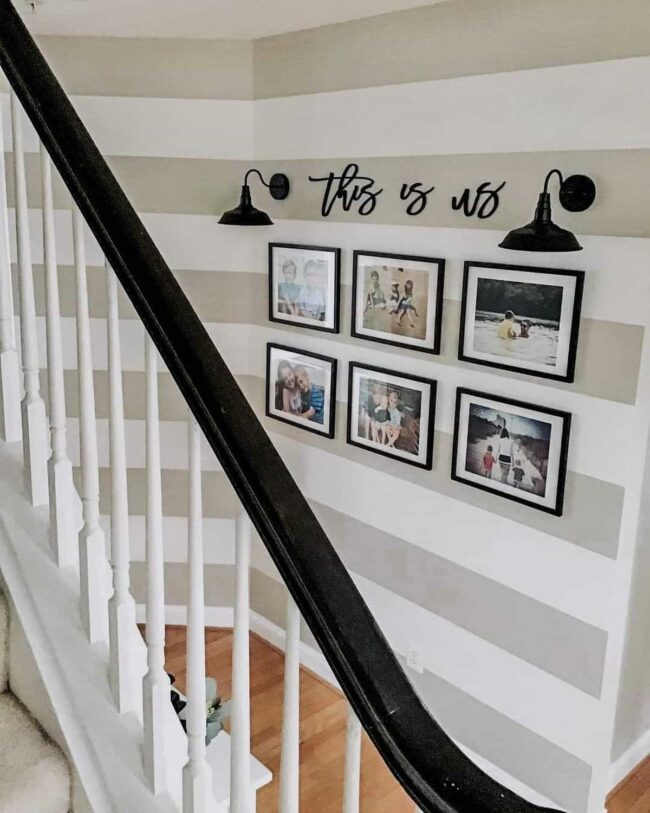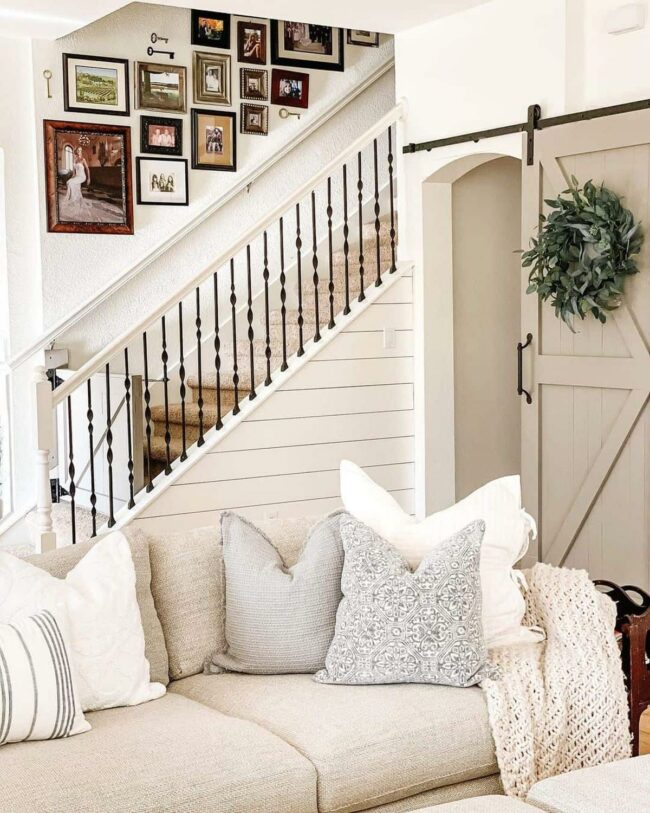 Gallery walls burst with personality when rustic frames cascade along a staircase, telling stories through carefully curated photographs and art pieces.