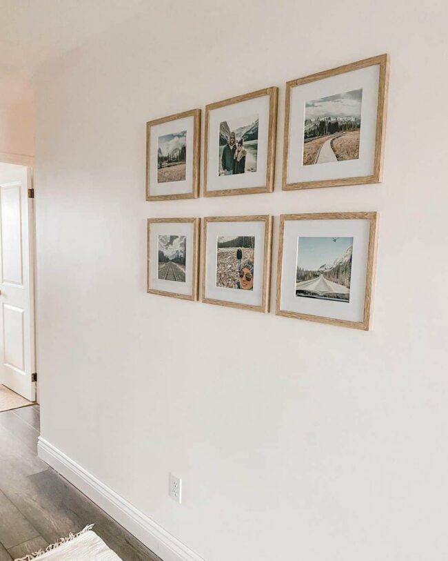 Wood frames complement the wall's neutral palette, adding warmth and depth.