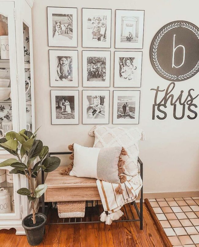 Beneath the gallery wall, a stylish black bench featuring warm wooden accents welcomes visitors to pause and unwind.