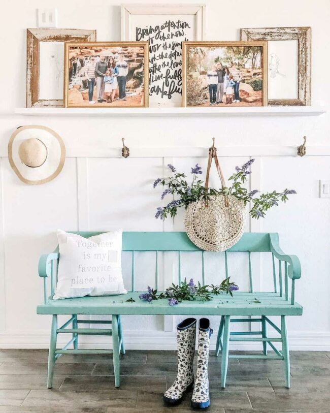 Strategic placement of hooks and seating makes the area both beautiful and useful.