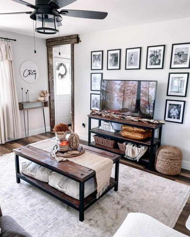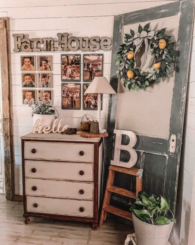 Rustic farmhouse walls radiate nostalgic charm with carefully arranged photo frames that tell personal stories.