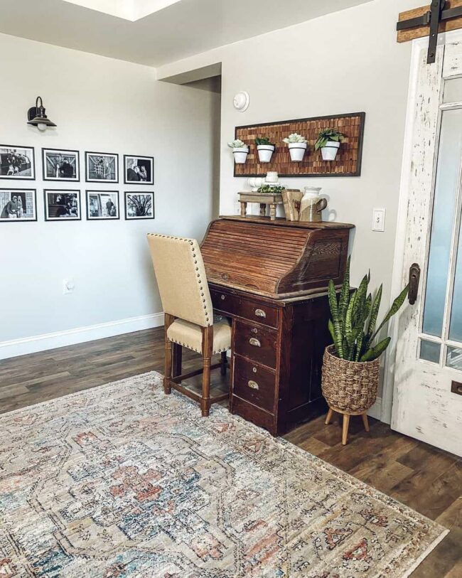 Shiplap walls and a charming barn door whisper farmhouse elegance, creating a welcoming atmosphere that feels both nostalgic and modern.