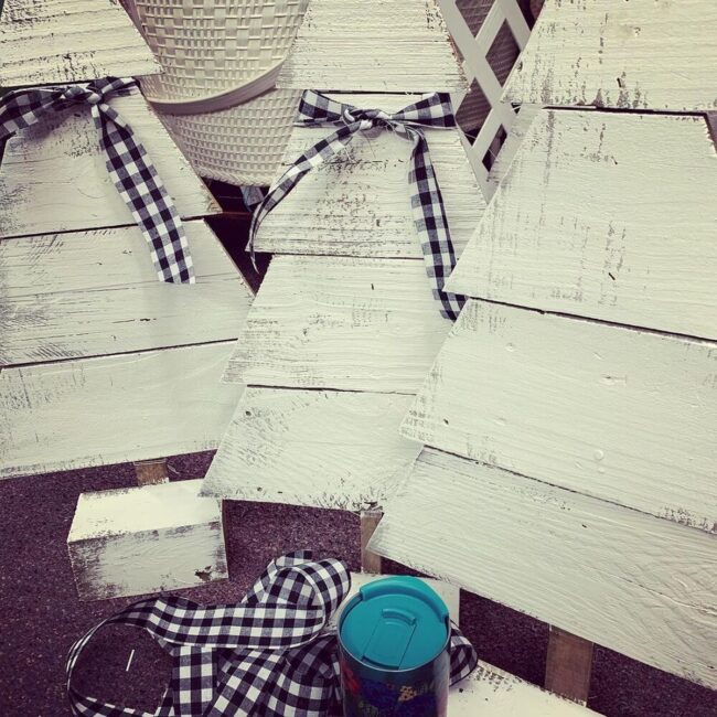 Rustic wooden trees adorned with buffalo check ribbons bring delightful holiday charm to home decor.