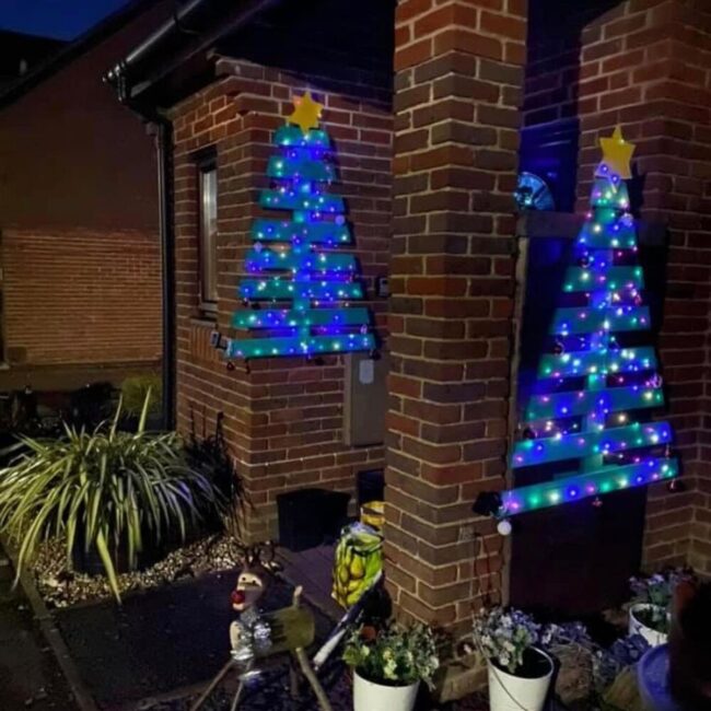 Classic wooden trees adorned with white LED lights create a mesmerizing outdoor display that captures the season's spirit.