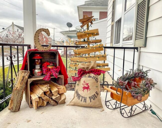 Wooden holiday decor transforms porches into magical winter wonderlands, where rustic charm meets festive cheer.
