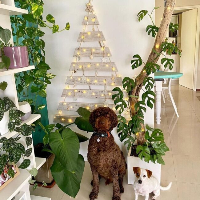 Holiday decorations shine with botanical elegance when monstera leaves complement wooden Christmas trees, creating an enchanting festive landscape.