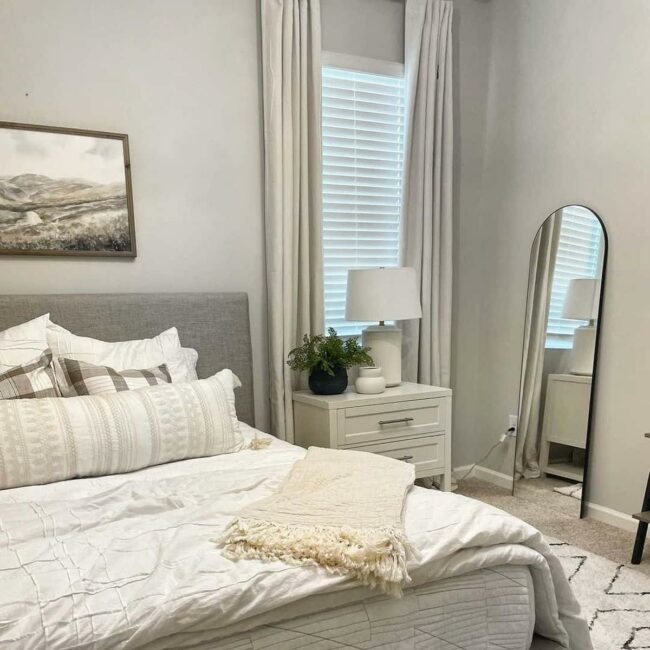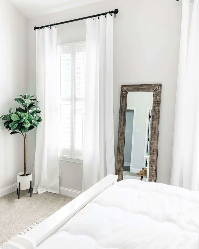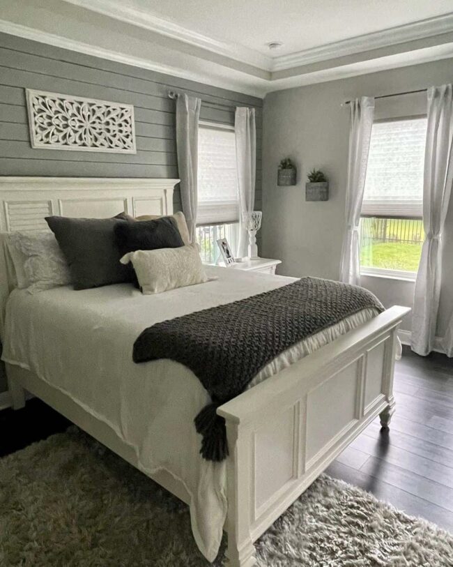 Welcoming medium gray walls complement crisp white curtains, creating a harmonious backdrop for relaxation.