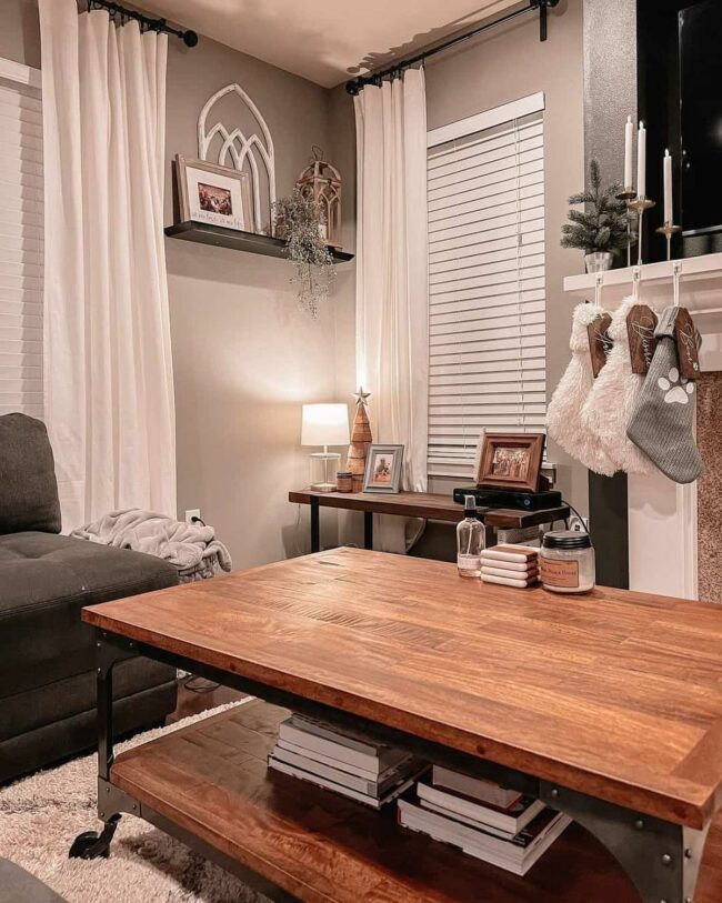 Wooden floors blend seamlessly with soft gray walls, creating an inviting sanctuary for unwinding or connecting with others.