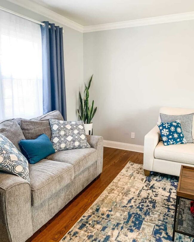The texture and material of the curtains also play an important role in complementing those cool-toned walls.