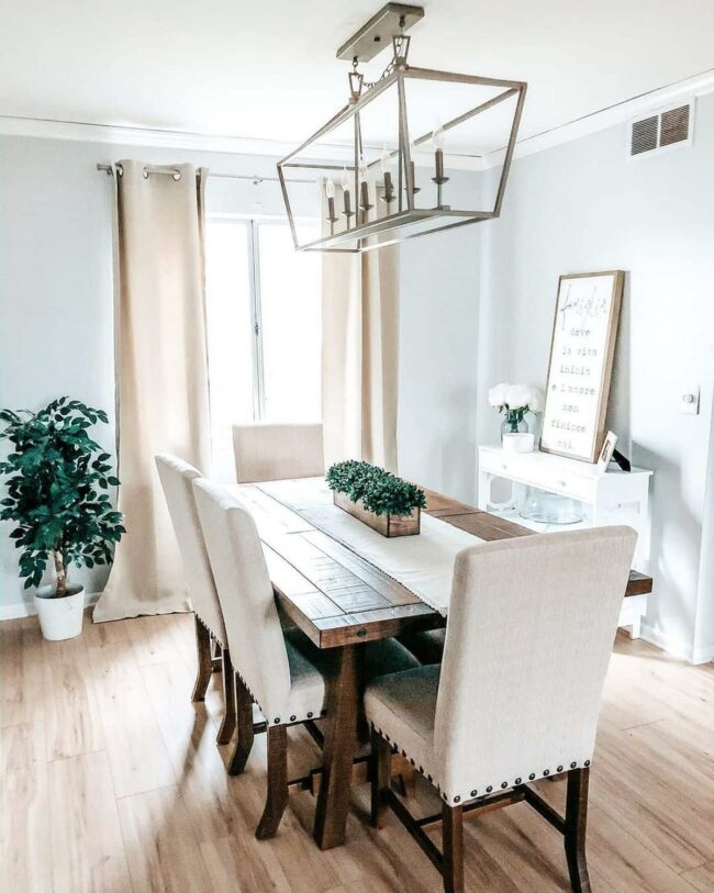 Warm wood tones define this minimalist farmhouse dining room, radiating comfort and elegance through carefully chosen design elements.