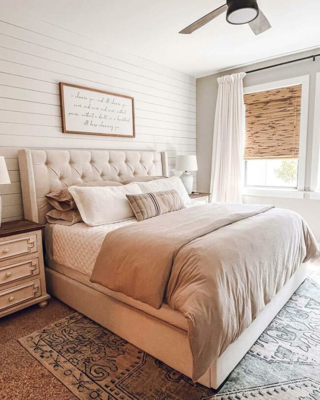 White shiplap accent walls add intriguing texture without overwhelming the space, drawing subtle visual interest to the room.