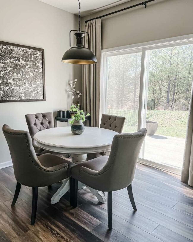 Neutral color schemes elevate dining spaces with understated sophistication, anchored by an antique black chandelier that gracefully illuminates the room's core.