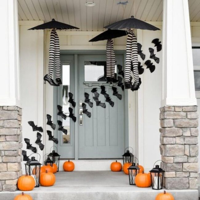 Witchy umbrellas with striped legs hang playfully overhead, suggesting supernatural mischief lurking just beyond your threshold.
