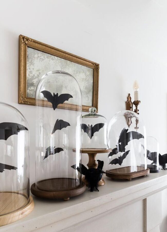 Dark bat silhouettes dramatically pop against pristine white walls, nestled artfully inside glass domes that catch mesmerizing light patterns.