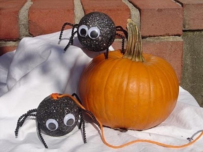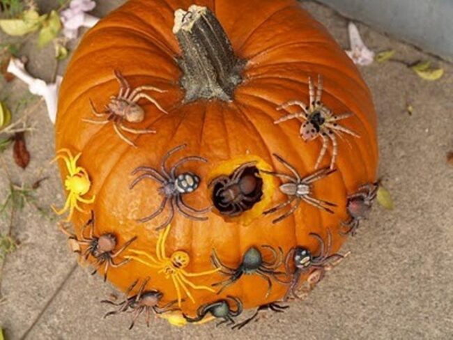 Rough bug legs contrast beautifully against polished pumpkin surfaces, inviting curious gazes and sparking pure Halloween excitement.