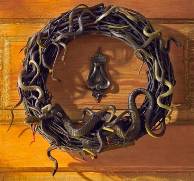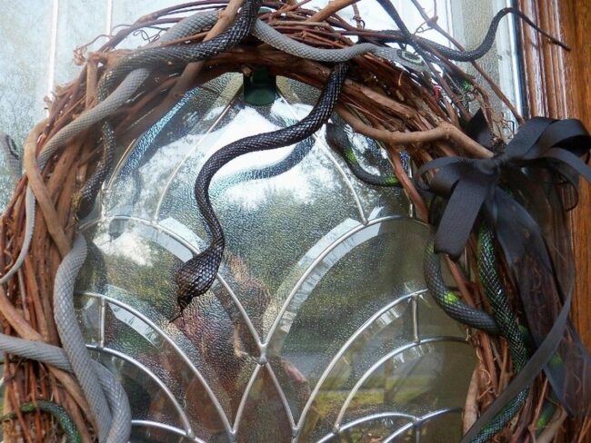 Snake-entwined wooden door wreaths burst with wild personality, turning ordinary entrances into extraordinary visual adventures.