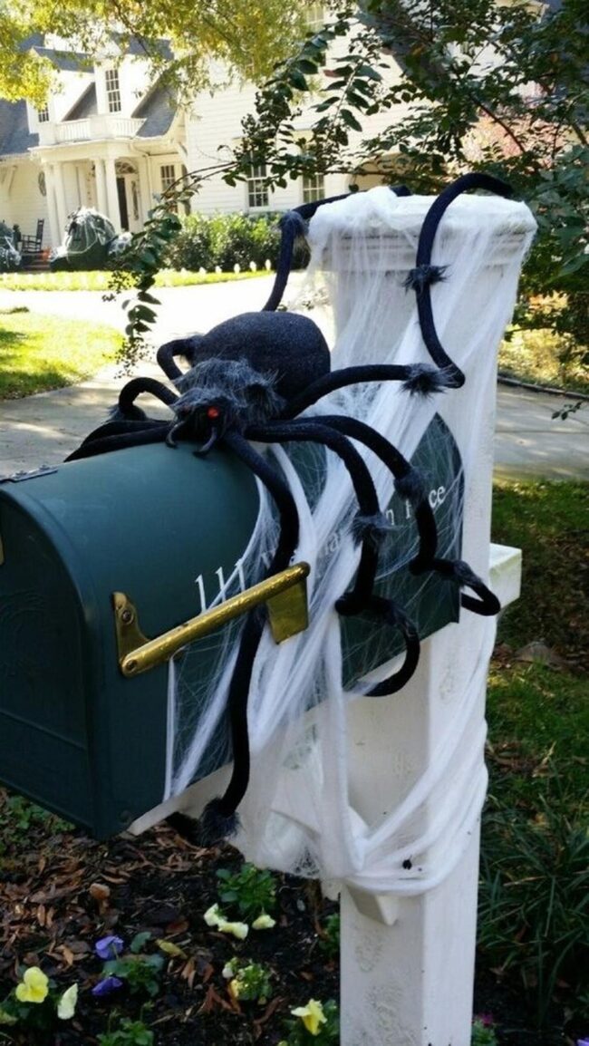 Halloween decorations burst with unexpected charm when black spider webs cascade dramatically across dark green mailbox posts.