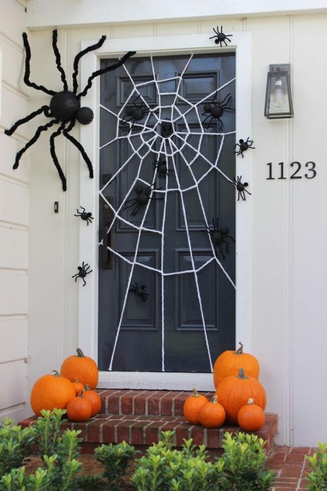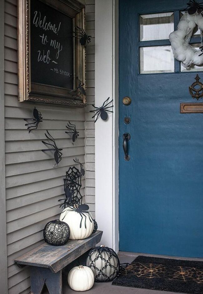 Dramatic dark door paint becomes the perfect canvas for intricate white spider webs stretching mysteriously across your entryway.