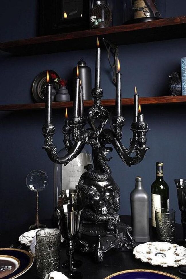 Dark walls and wooden shelves whisper dramatic stories in moody interiors, where black candelabras with intricate skull and snake designs stand guard like silent sentinels.