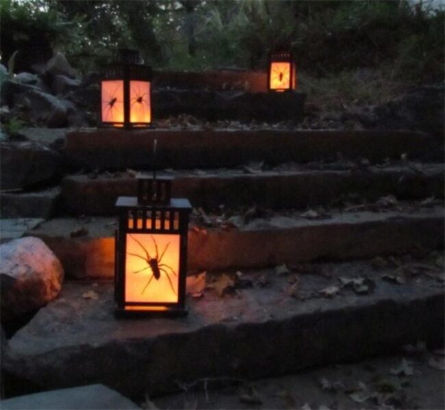 Silhouetted spiders nestled inside each illuminated lamp add a delightful hint of intrigue to the landscape.
