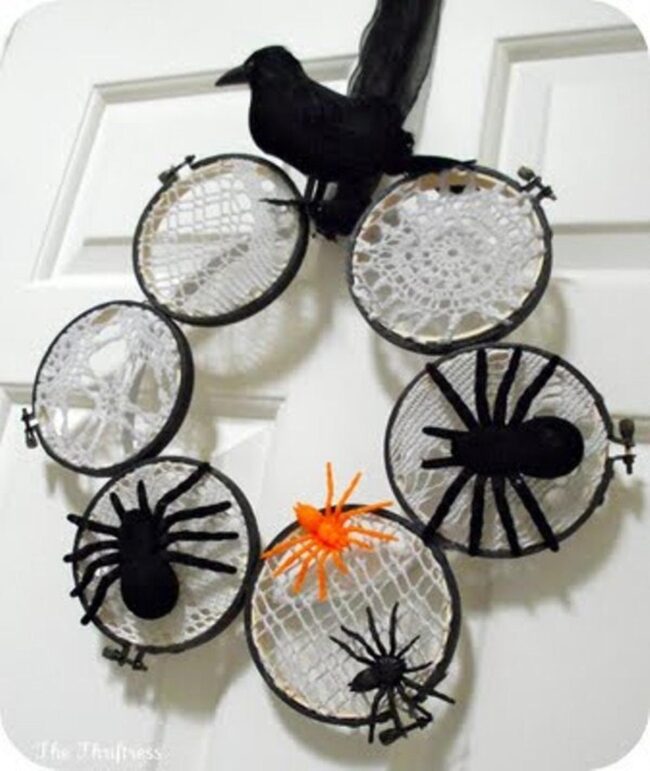 Halloween door decor springs to life with magical charm, weaving delicate white threads into enchanting spider webs inside circular embroidery hoops.