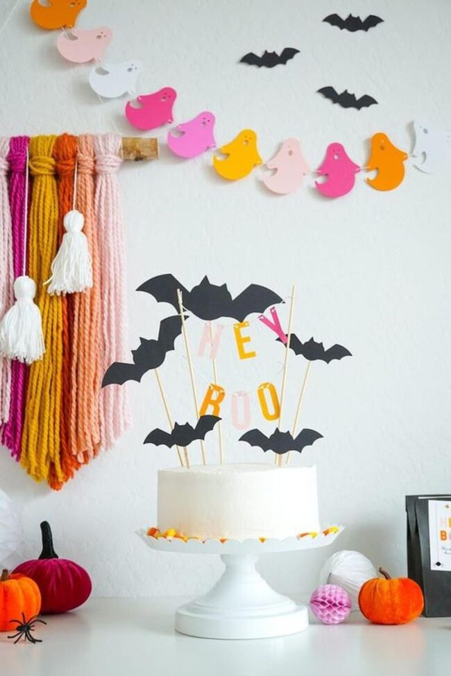 Delicate black paper bats swirl overhead, hinting at midnight mischief waiting to unfold.