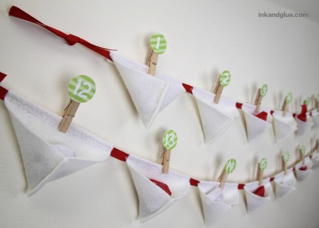 Wooden clips hugging numbered green circles connect delicate white felt triangles along a vibrant red ribbon, creating an irresistible seasonal treasure.