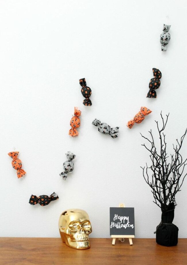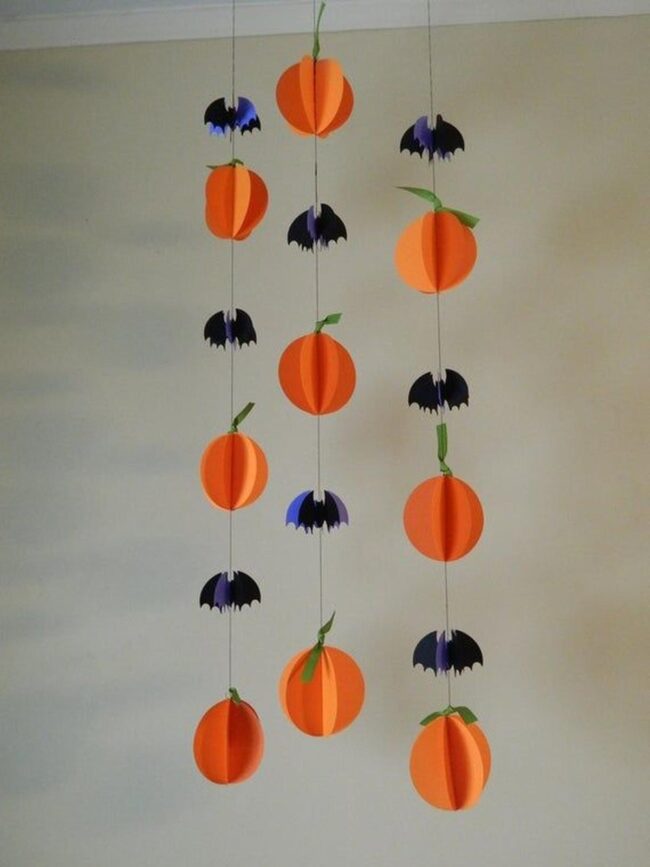 Halloween spirit bursts through delightful paper pumpkins that dance across walls with effortless charm.
