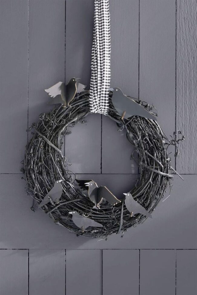 Sleek silver doorknobs and vertical panels provide a perfect backdrop, letting the wreath shine with its artistic flair.