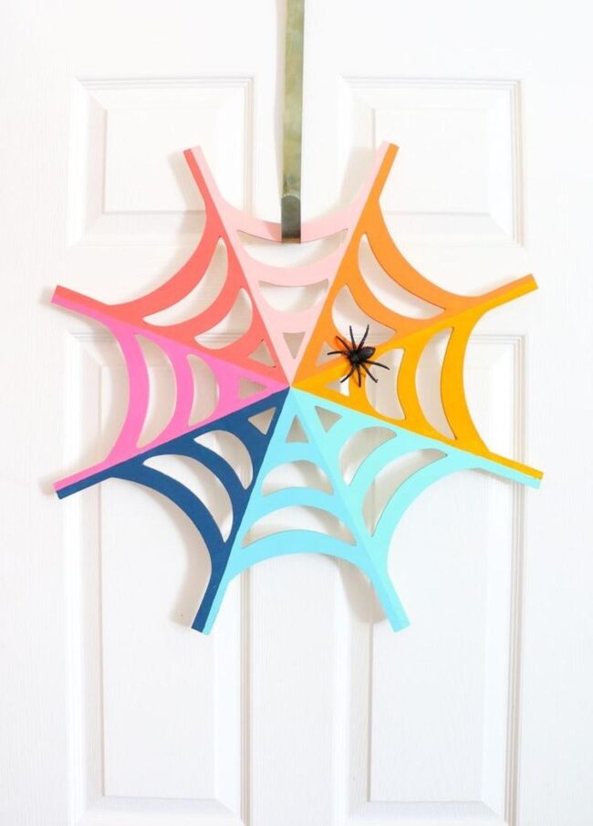 Hanging near white doors or light backgrounds, these colorful web designs become instant focal points that radiate joyful Halloween spirit.