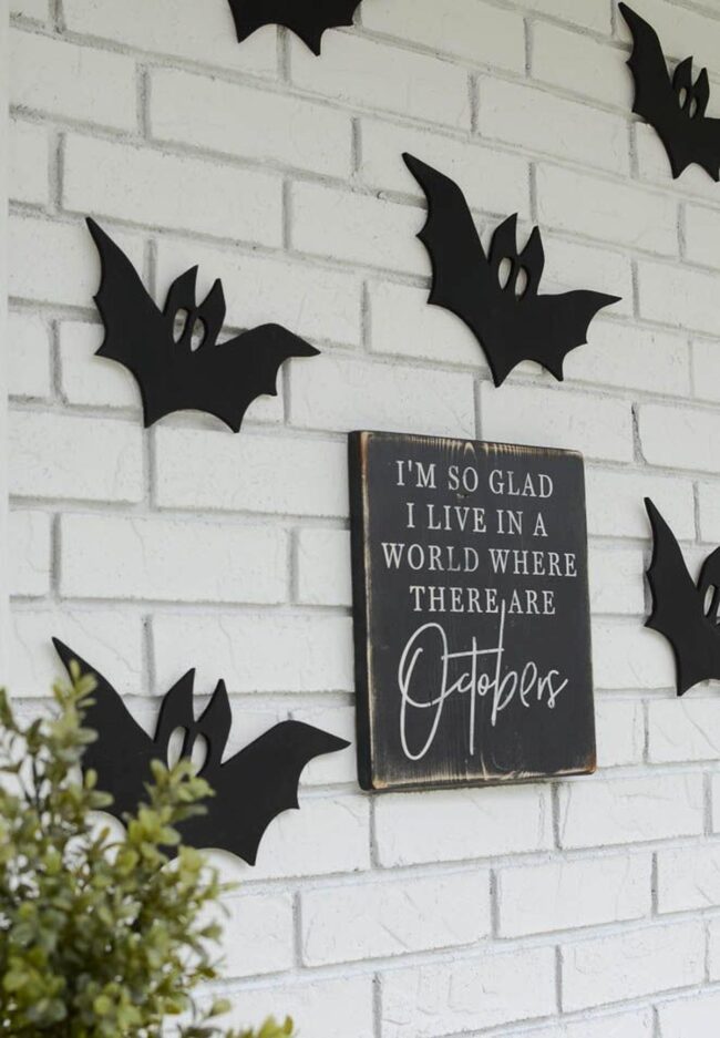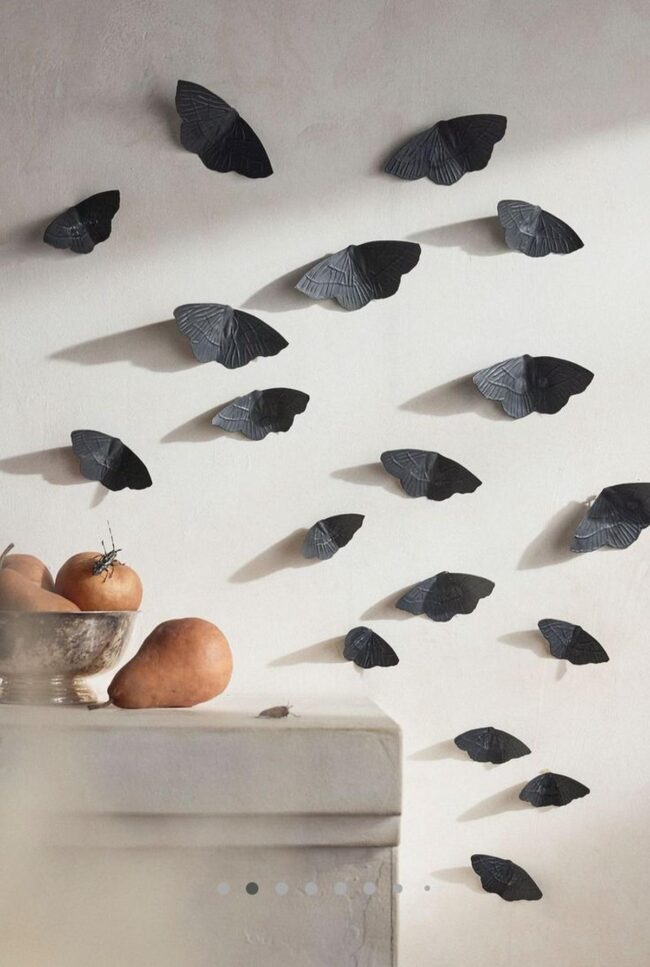 Clever black paper bats swoop dramatically across crisp white walls, instantly changing boring spaces into exciting visual stories.