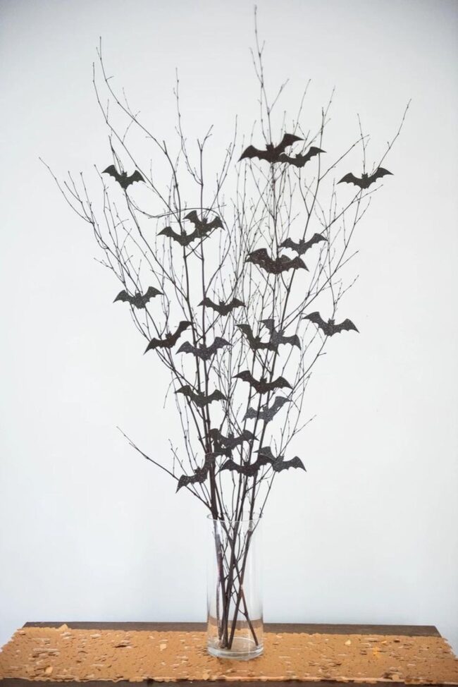 Quirky black paper bats peek playfully from behind the arrangement, adding a touch of Halloween mischief to the scene.