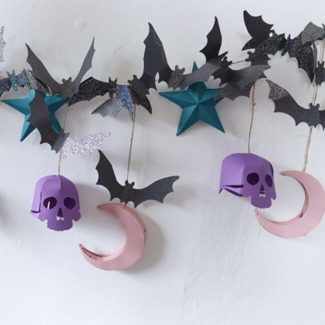 Purple skulls and pink crescent moons dangle playfully from strings, creating whimsical magic in your space.