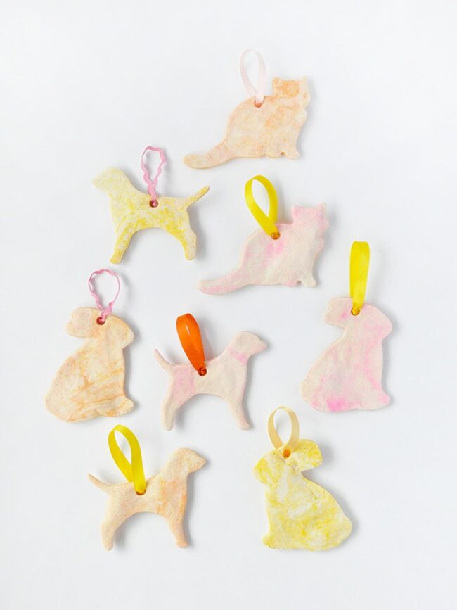 Delicate ribbon loops renew tiny dog and cat shapes into magical hanging treasures that catch light and hearts with equal grace.