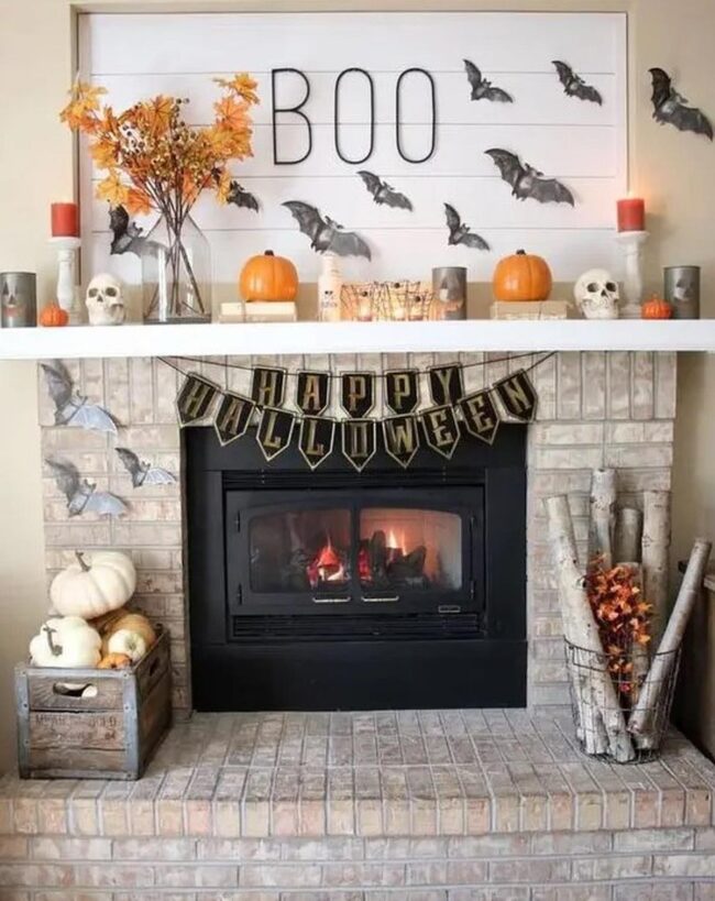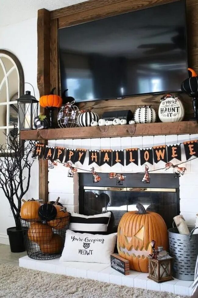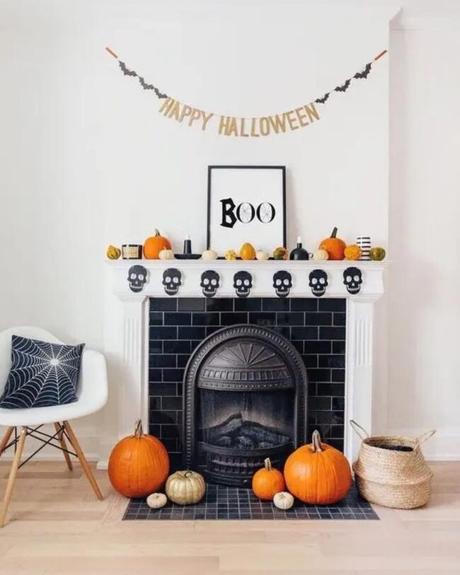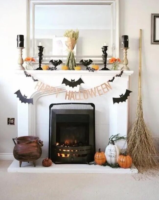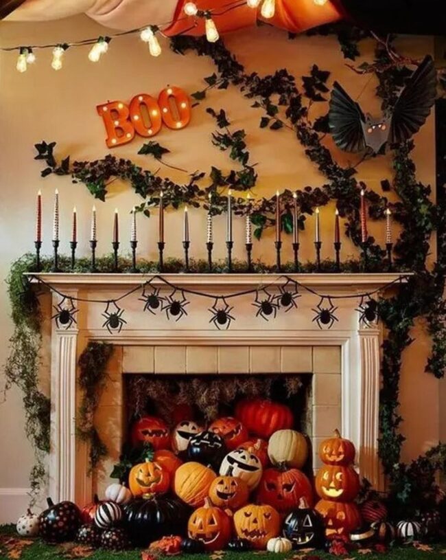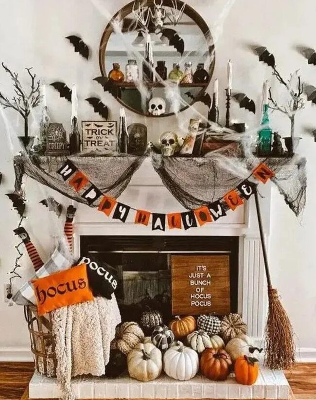Fireplace decorations burst with Halloween magic, drawing eyes to an enchanting seasonal scene.
