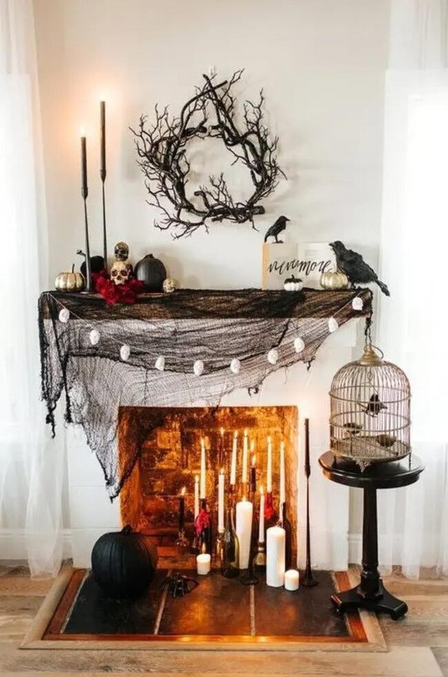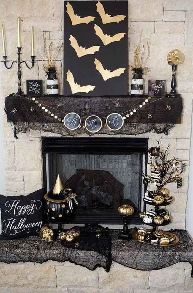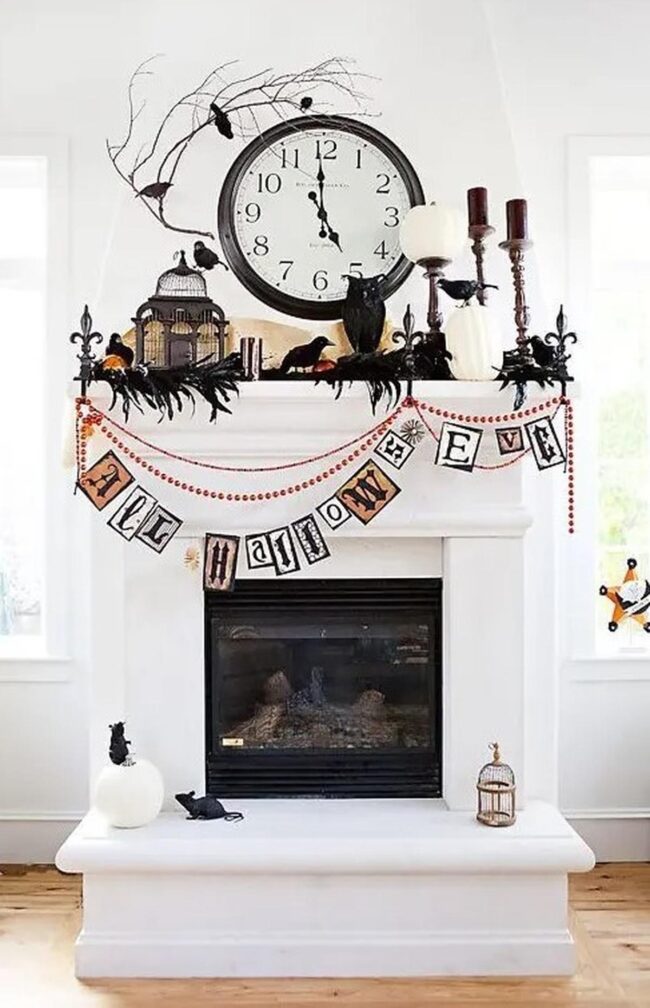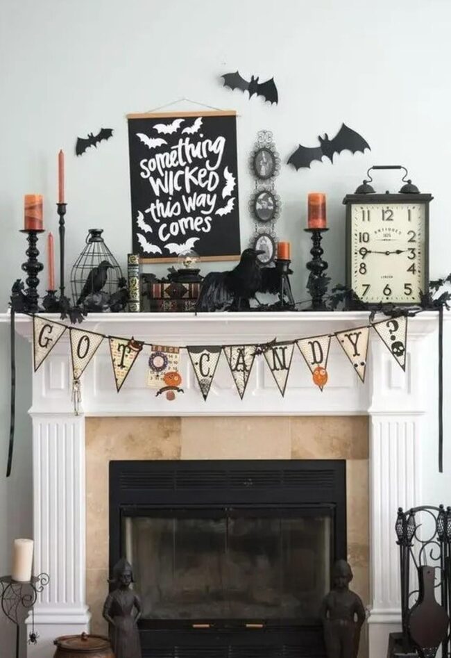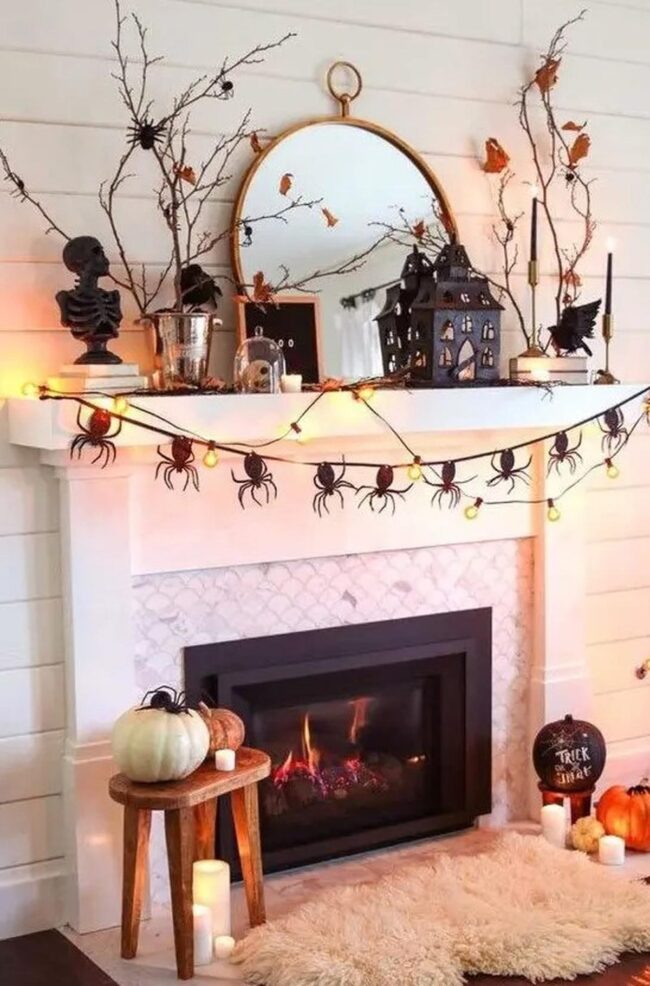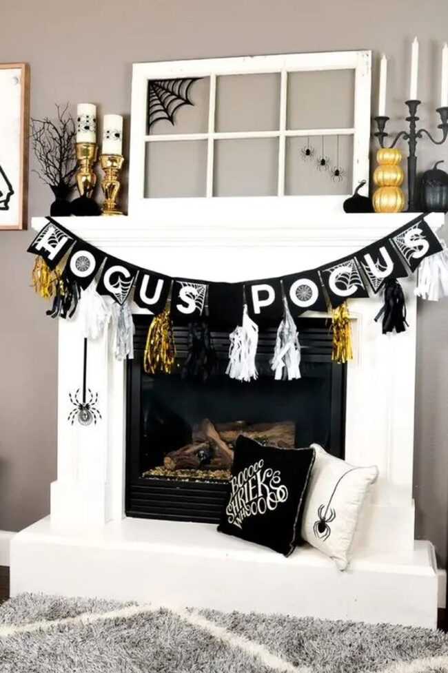 Fireplace decorations burst with Halloween magic, drawing eyes to an enchanting seasonal scene.