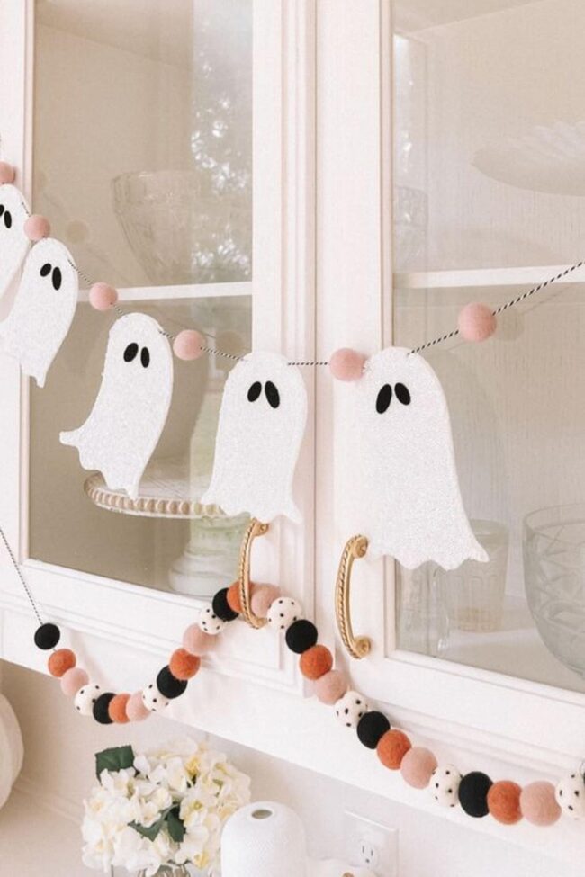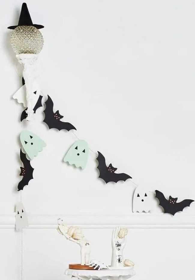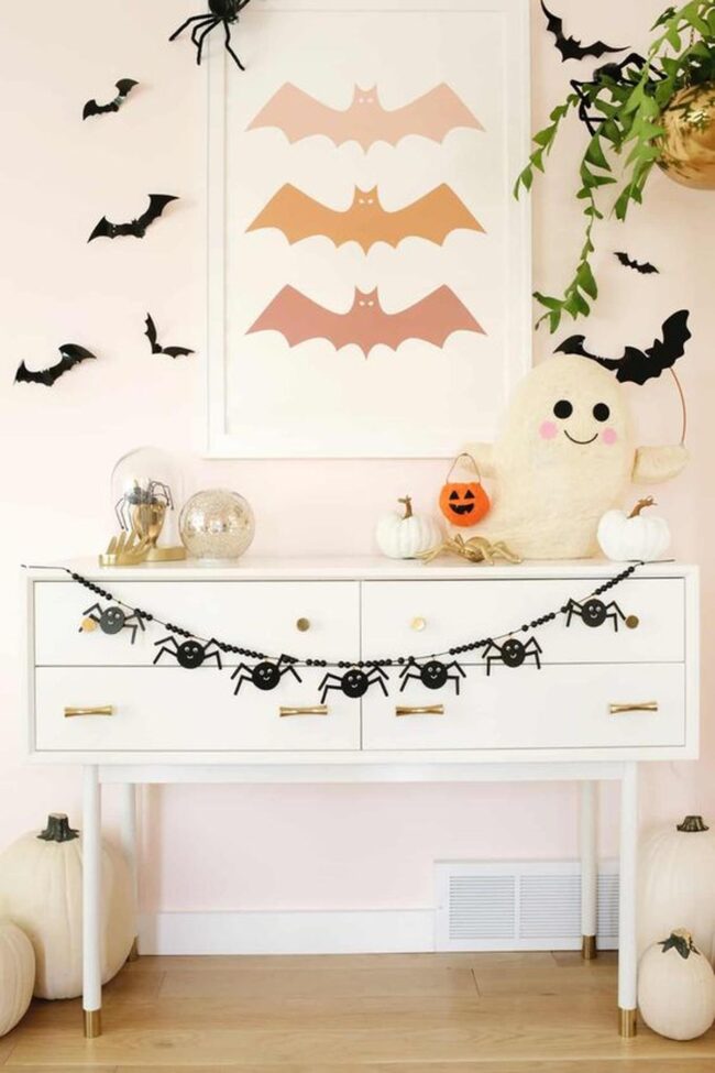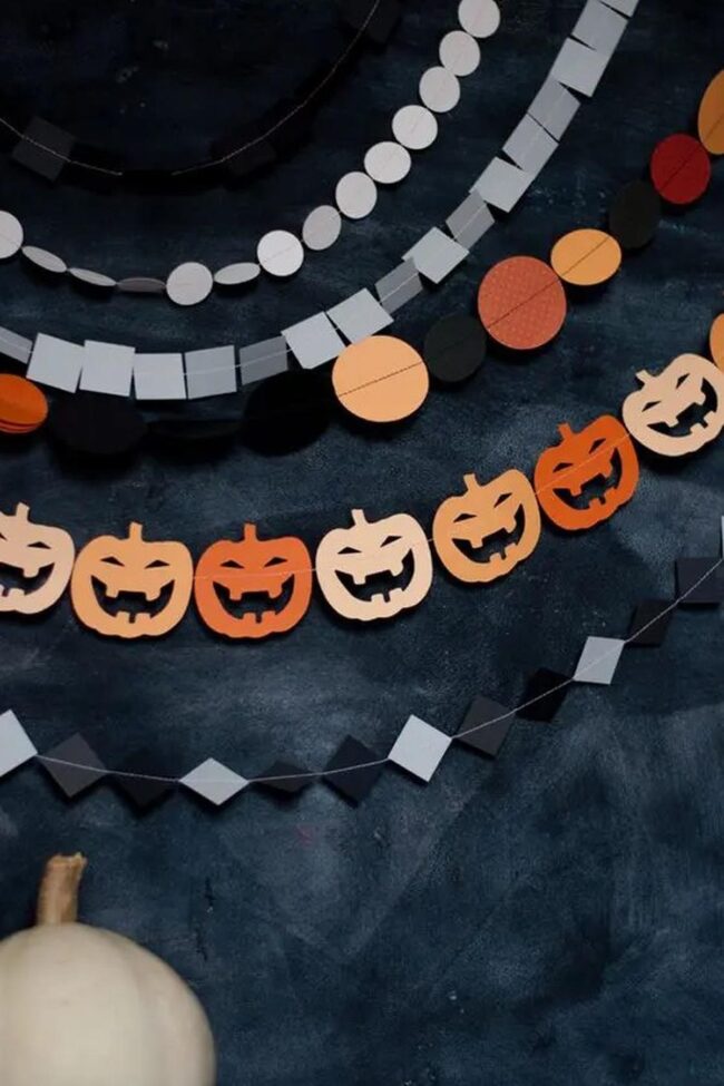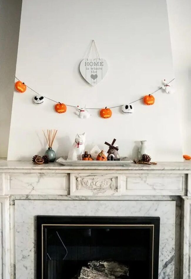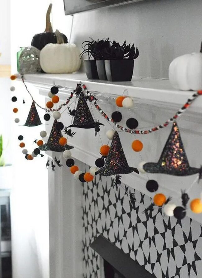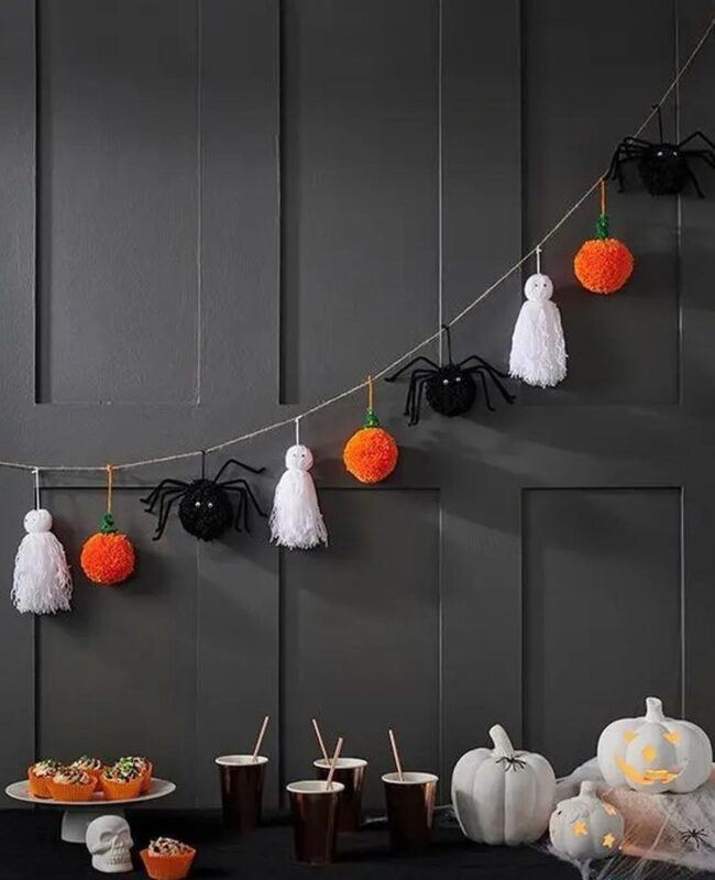 Festive garlands in classic Halloween colors like orange, black, and white tie the entire scene together with spirited charm.