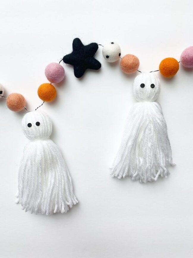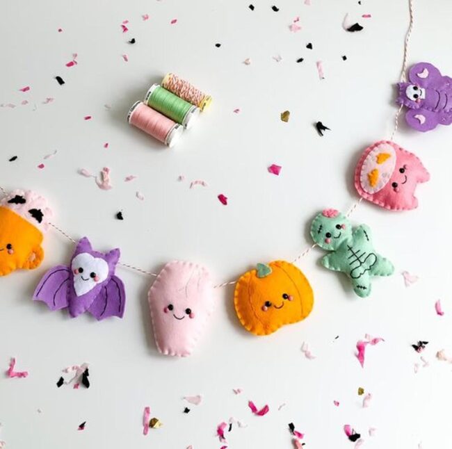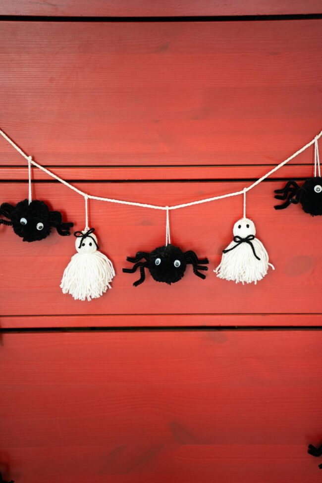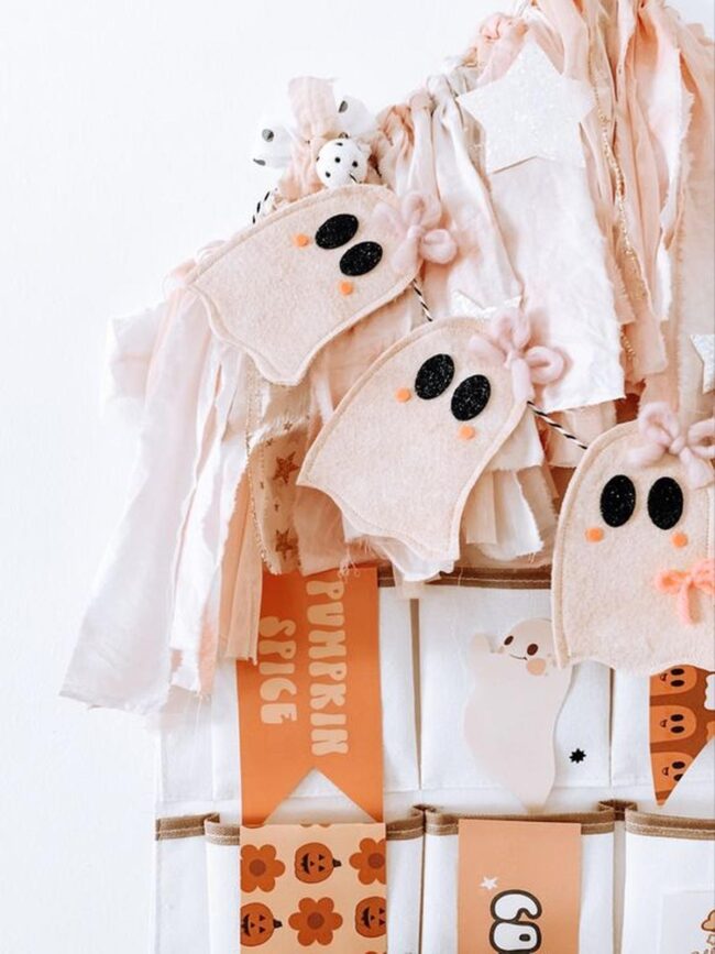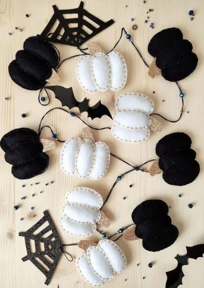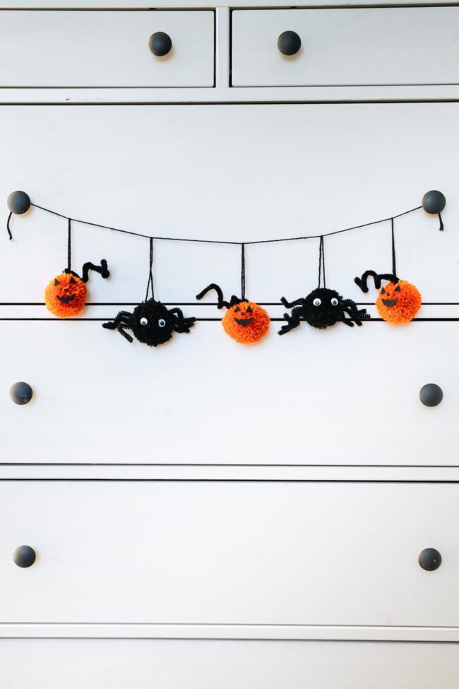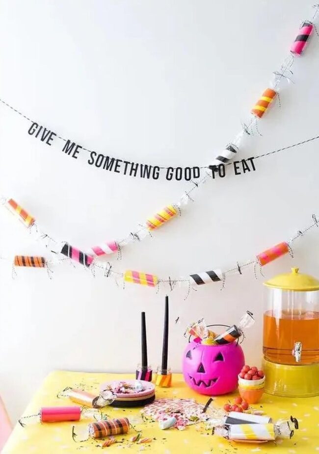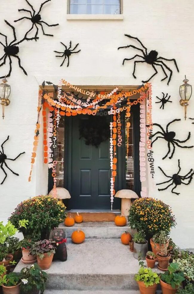 Festive garlands in classic Halloween colors like orange, black, and white tie the entire scene together with spirited charm.