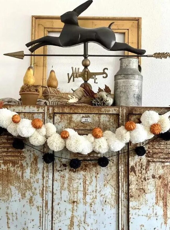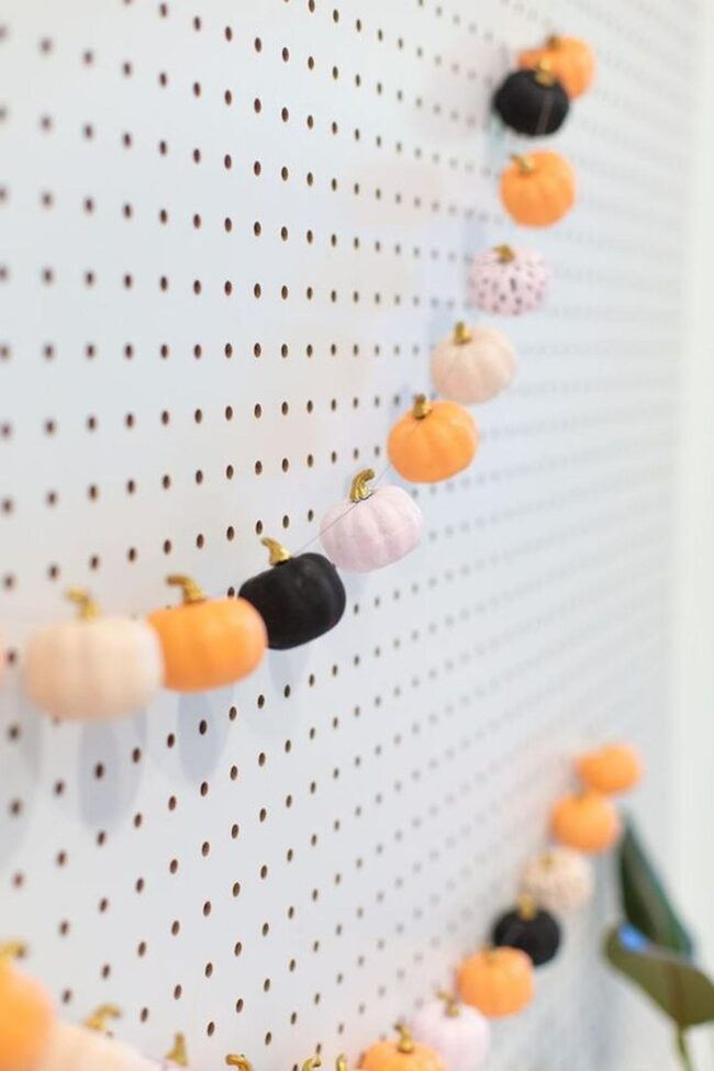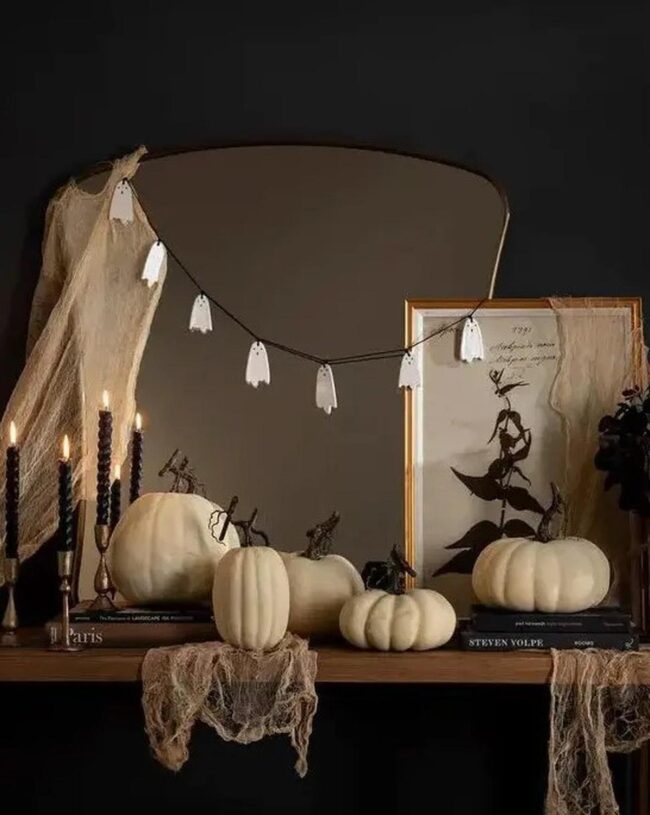 Crisp autumn vibes sweep through your space when dark walls become the perfect canvas for white pumpkins that pop with stunning contrast.