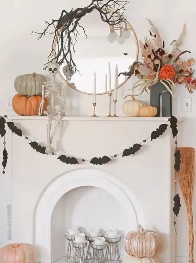 Orange and black decorations weave playful patterns across white mantels, where silver containers hold dried leaf branches and mysterious statues.