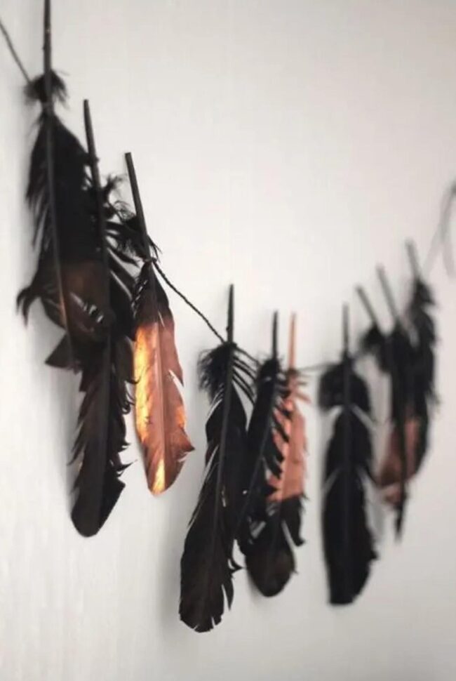 Delicate feathers dance from slender strings, casting enchanting shadows that shift with every gentle breeze.