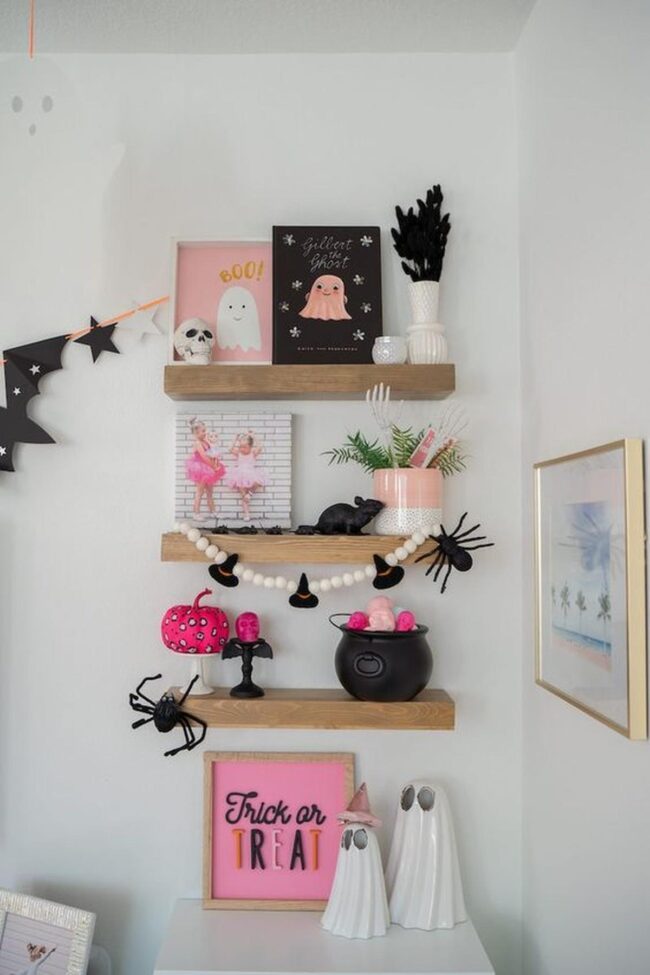 Wooden shelves become magical displays hosting adorable ghost pictures, quirky skull figurines, and a black cauldron overflowing with sweet pink treats.