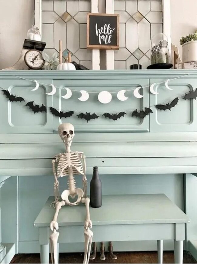 Delicate skeleton decorations swing gently, adding whimsical charm to the space.