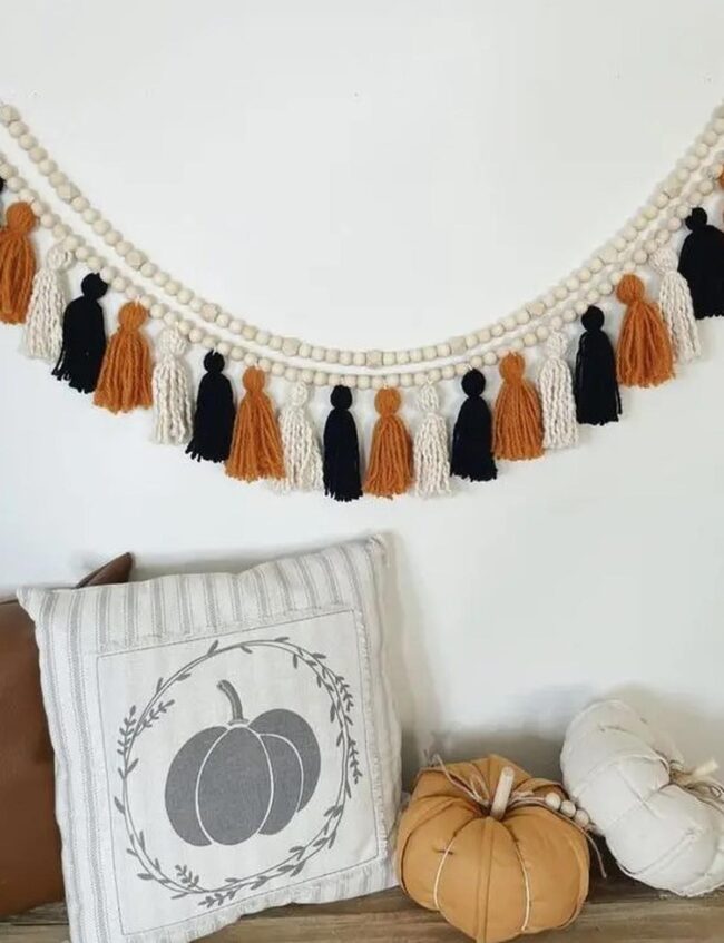 Soft pom-pom garlands in white, orange, and black dance across the scene, adding playful movement and depth to every corner.