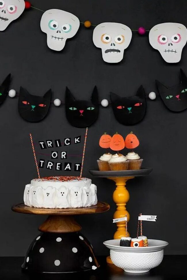 Adorable ghost-shaped cake embellishments paired with a whimsical "Trick or Treat" sign promise delightful surprises for party guests.