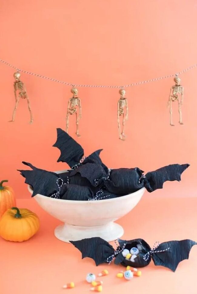 Unexpected color combinations draw your eye across the scene, where black bat-shaped treats peek from a crisp white bowl.