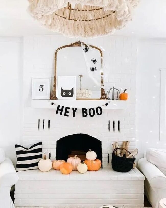 Woven baskets filled with firewood stand ready for cozy moments, while playful "HEY BOO" banners inject whimsical spirit into the room.