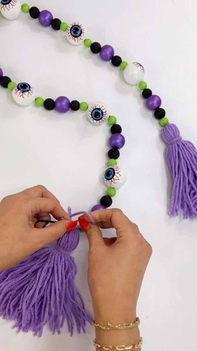 Purple yarn tassels dramatically dangle from delicate strands, catching your eye and drawing you closer to explore intricate details.