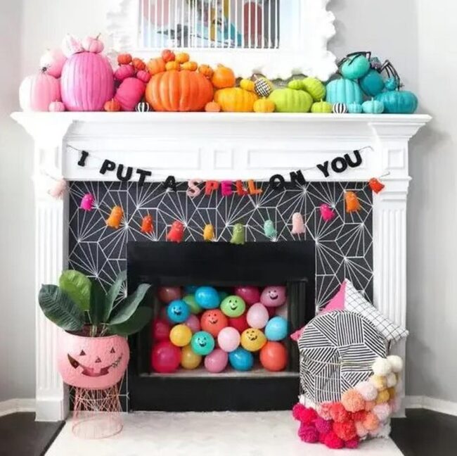 Smiley-faced balloons nestled inside the fireplace inject instant joy into your space, while a pink jack-o'-lantern plant pot filled with lush green leaves brings unexpected freshness to the scene.